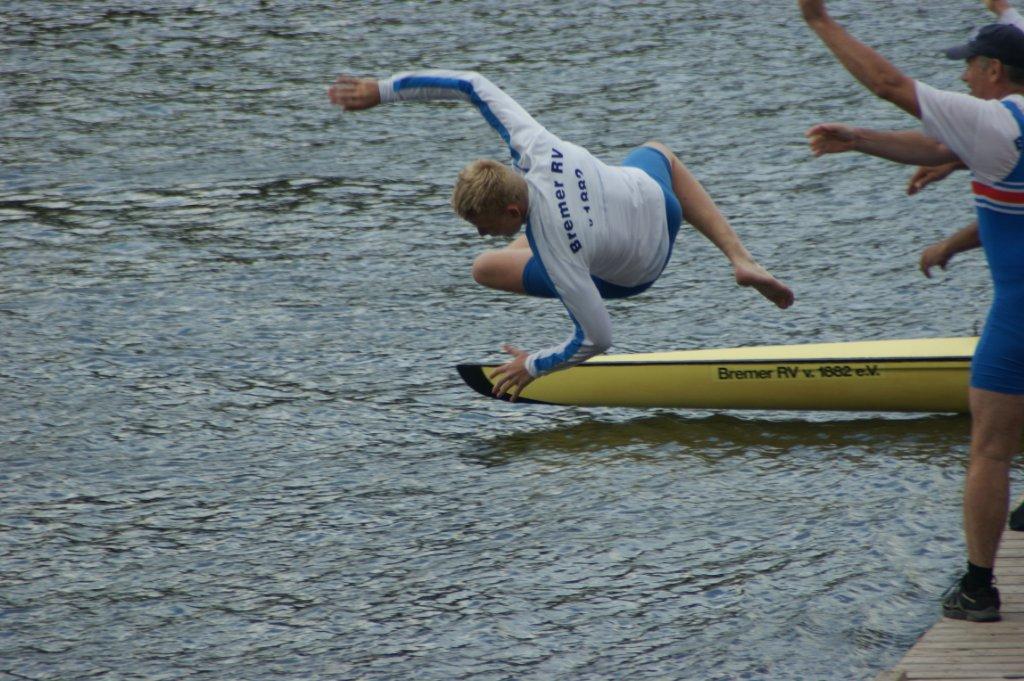 Mit mehr Staus als Finger an den Händen haben wir den Weg nach Bitterfeld zur zweiten flyeralarm Ruder-Bundesliga erfolgreich hinter uns gebracht. Nach Boot aufriggern und Nudeln aus der Gulaschkanone bezog der Bremen erleben!-Achter fröhlich die für ihn bestimmten Plätze in Gang 4. Der Schlaf war gut, die Duschen warm, nur der Regen, der nachts lautstark aufs Hallendach geprasselt hatte machte uns Sorgen. Aber wir Bremer sind Schietwetter gewohnt, also sollte uns auch das nicht aufhalten!