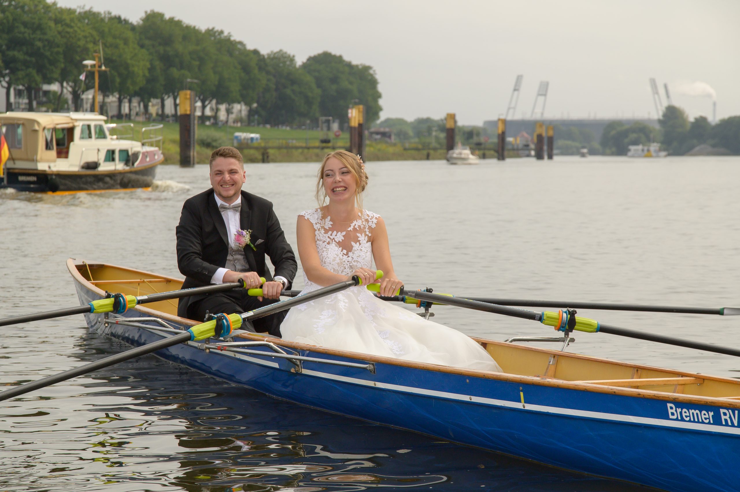 Am 21.08.2021 gaben sich David und Melina das Ja-Wort. Dabei plante das Paar auch, sich von dem Fotografen Thomas Schütze, https://shootings-online.de/, am Steg des Bremer Rudervereins von 1882 e.V. Hochzeitsfotos erstellen zu lassen. Dabei fragte das Paar auch Klaus Hartstock, der zufällig am Verein war, ob sie eine Decke haben könnten. Doch hieraus entstand schnell die Idee, das Hochzeitspaar in ein Ruderboot zu setzen. Dabei entstanden sehr schöne Fotos….
