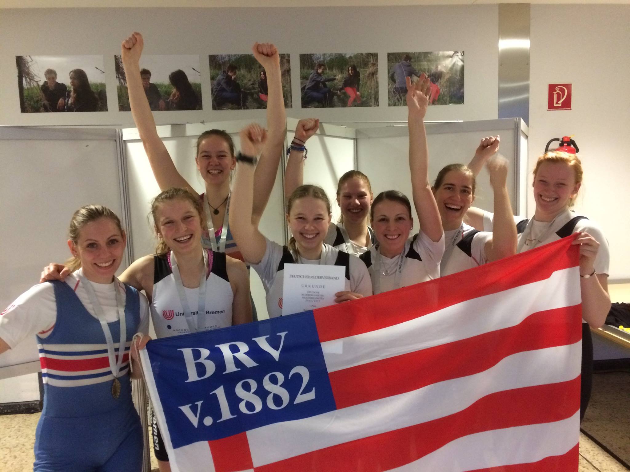 Beim ‘dööööt‘-Ton geht es los. 350 Meter, zwei Achter, 16 Frauen, die sich alles abverlangen. Nach 1:08,6 min ist es für das Team aus Bremen vorbei. Mit 1,4 Sekunden vor Essen-Kettwig gewinnen Melanie Baues, Levke Gill, Jannika Moye, Ann-Kathrin Weber, Eleni Melis (BRV 1882), Julia Lange, Judith Fischer (Bremerhaven) und Luise Asmussen (Vegesack) Gold im Frauen-Achter Sprint!