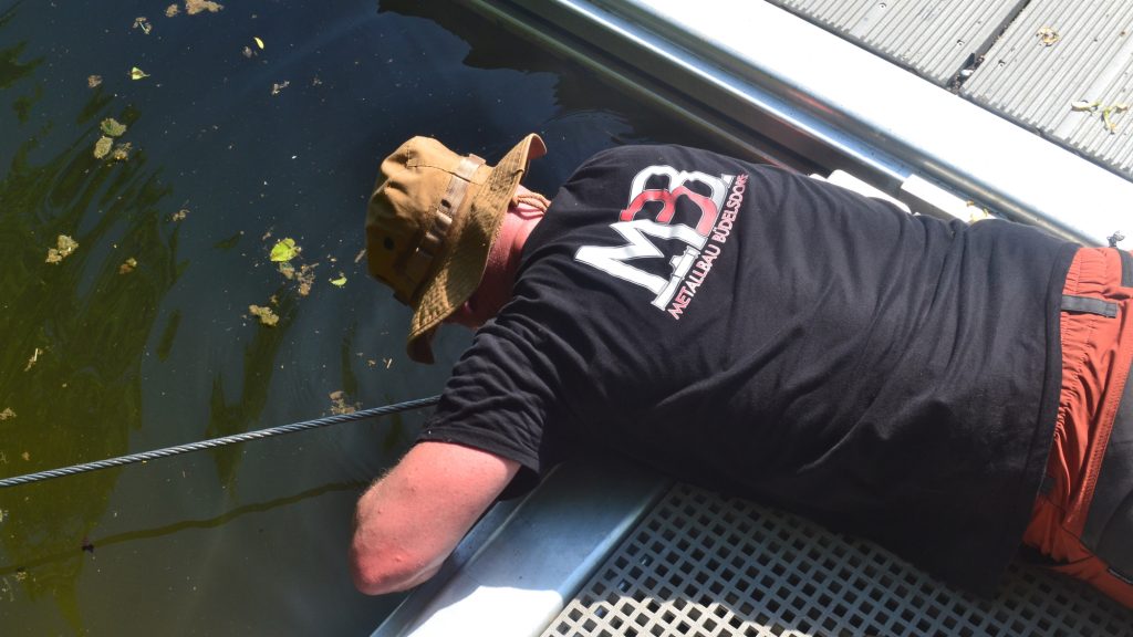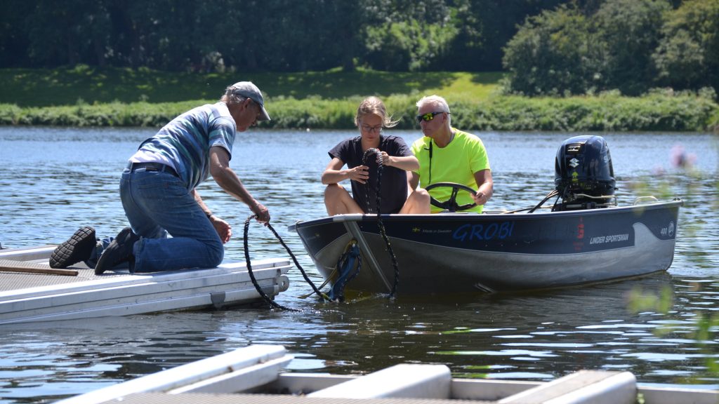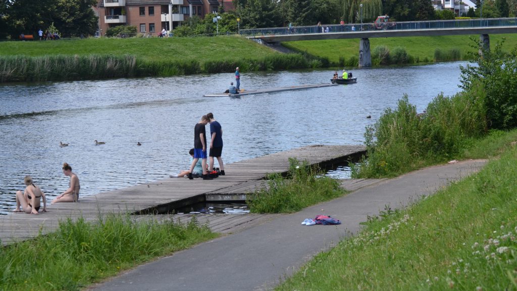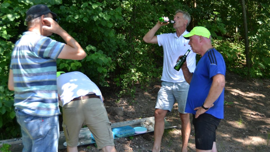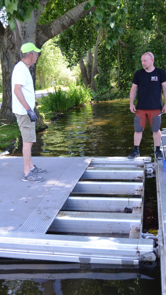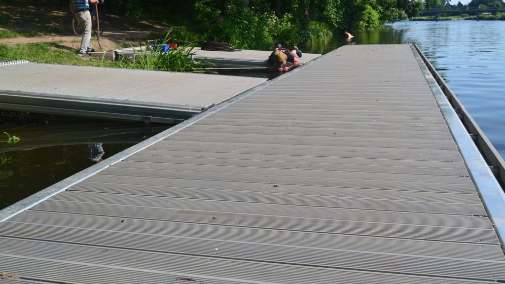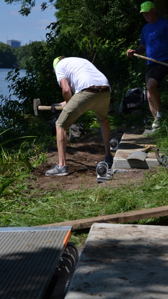 Hitze und pralle Sonne ließen den Schweiß fließen. Der Aufwand erwies sich schnell als deutlich höher als zunächst eingeschätzt: Nach dem Start um 10 Uhr konnten die letzten Handgriffe nicht wie geplant gegen 13 Uhr erledigt werden. Erst gegen 16:30 Uhr war der neue Steg einsatzbereit.