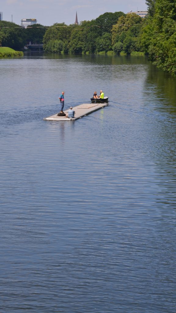 Zehn Freiwillige aus den Rudervereinen und ein Fachmann der Firma Alu-Bau aus Rendsburg waren nötig, um am Dienstag, 25.06.24 den neuen Werdersee-Steg von seinem Regatta-Liegeplatz zum Sommer-Liegeplatz unterhalb der Fußgängerbrücke an der kleinen Weser zu transportieren. Nach der Installation im November 23 war das der erste Umzug und es ging auch darum, Erkenntnisse hinsichtlich des Arbeits-Aufwandes zu bekommen.