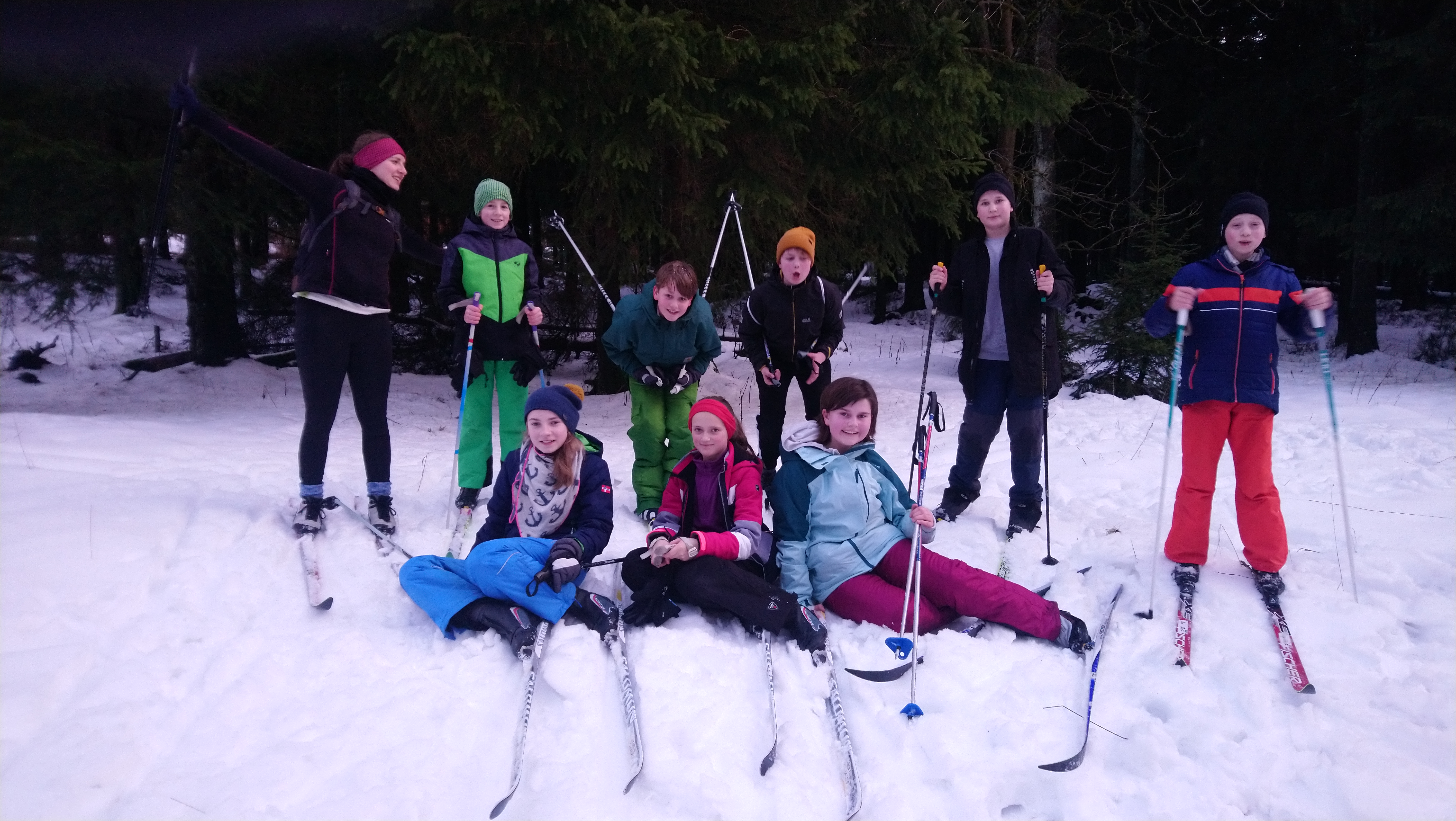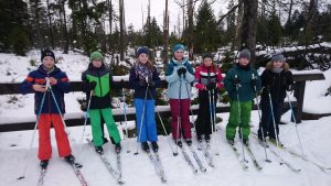 Der Samstag startete mit einem reichhaltigen Frühstück. Danach ging es für die Anfänger erstmal auf die Schneefläche vor der Jugendherberge. Neben dem Finden des Gleichgewichts und das Lernen des richtigen Abdrucks, lernten sie auch wie sie einen Berg hoch und wieder runter kommen. Nachdem alle schnell Fortschritte gemacht haben ging es noch eine kurze Runde zum Sonnenberg auf ein kurzes Stück einer (leider nicht gespurten) Loipe. Zur Mittagspause ging es für alle wieder zurück in die warme Unterkunft zum Mittagsessen. Nach der Pause ging es für alle nochmal auf die Langlauf-Skier zu einem Biathlon-Wettkampf. In Zweier-Teams (immer ein Kind und ein Junior) ging es auf einen kleinen Rundkurs mit einem Slalomteil und einer Wurfstation. Mit viel Spaß und Motivation ging es danach für die Junioren in die Sporthalle der Jugendherberge und für die Kinder auf die Schneewittchen-Loipe am Sonnenberg. Das ging noch gerade so, da Plusgrade herrschten und der Schnee immer weniger wurde. Es schafften alle Kinder die 5,4 km-lange Strecke mit schwierigen Anstiegen und Abfahrten. Nach dem Abendessen machten wir alle zusammen noch einen Spieleabend mit Uno, Werwolf und anderen Kartenspielen.