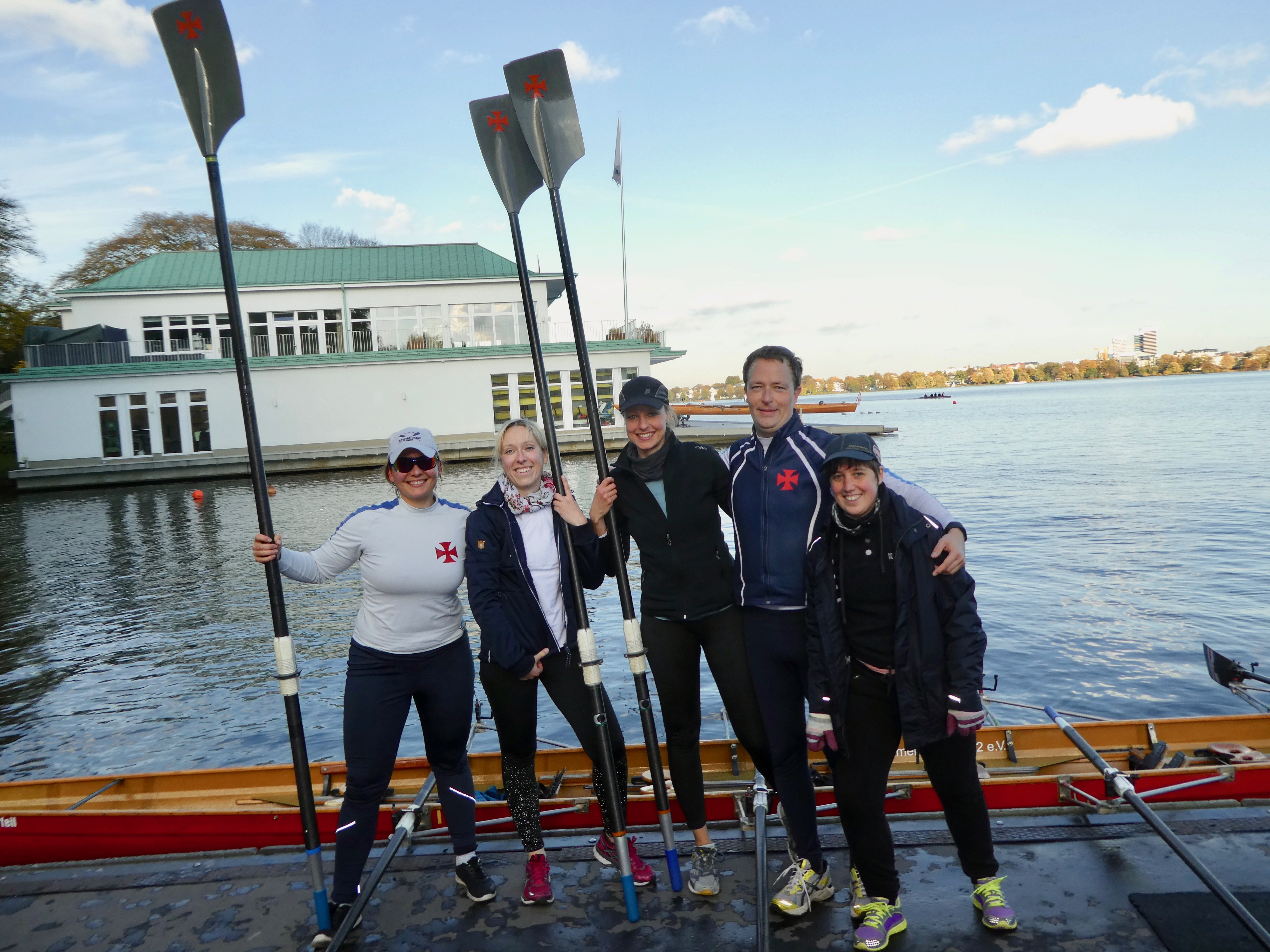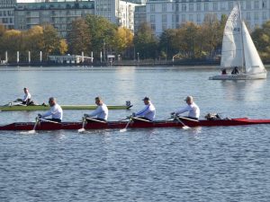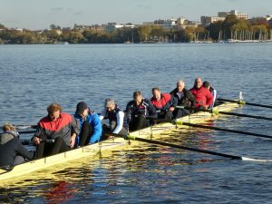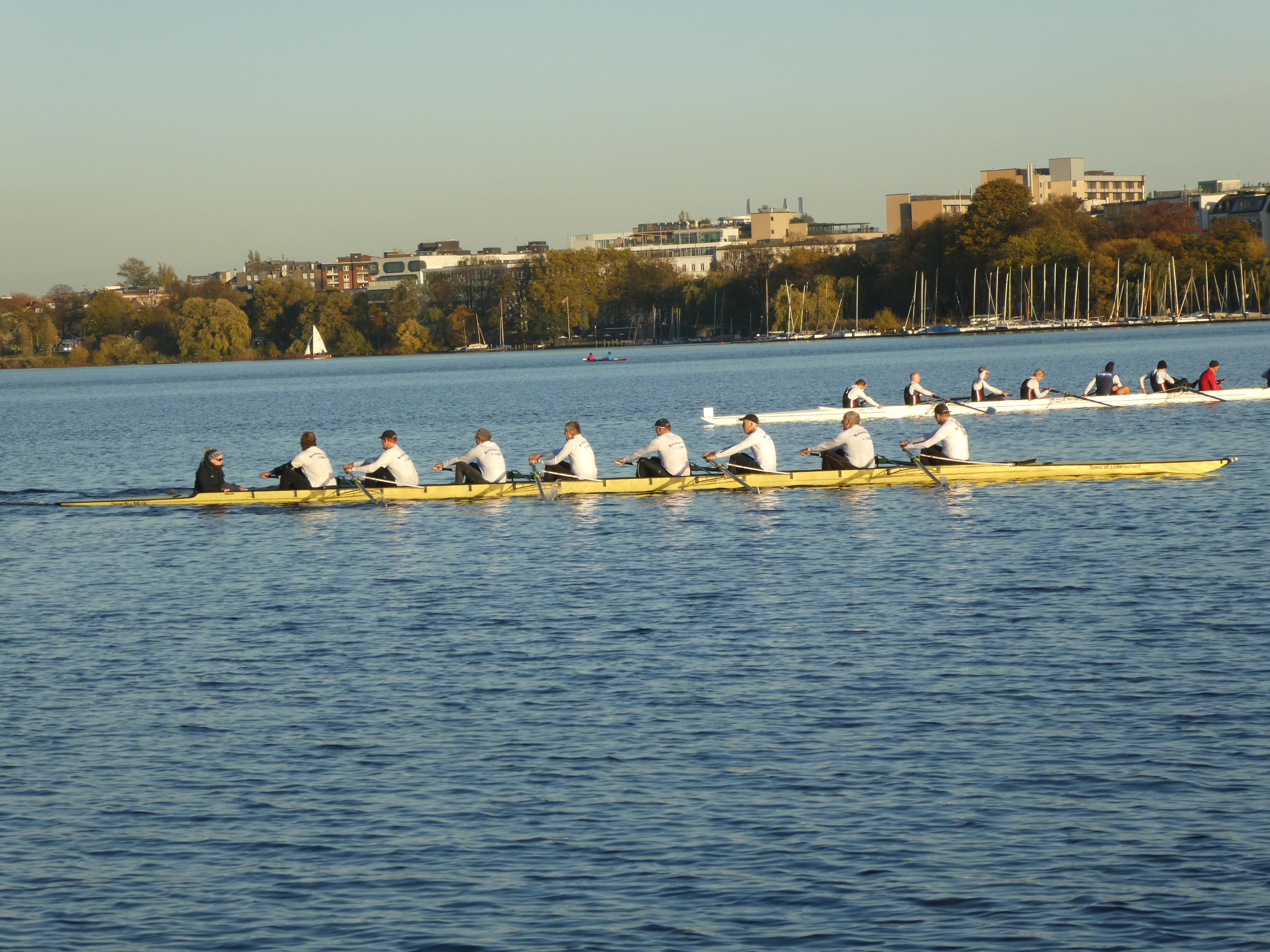 Die Aufgabe für die Achter war es, vom Sattelplatz bei Fari 7,5 km zum Start an der Schleuse in Ohlsdorf zu rudern und dann ab Start unter der Sengelmannbrücke möglichst deutlich schneller bis zum Ziel zurück zu rudern. Dank guter Vorbereitung gelang das beiden Mannschaften zur vollen Zufriedenheit der Beteiligten. Der Achter Altersklasse F (Mindestdurchschnittsalter 60) machte das in 32:40, die Kollegen in D (MDA 50 ) in 29:52, was den 2. (von 2) bzw 3. (von 8) Platz ergab.