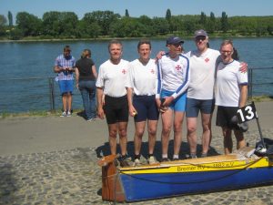 Die Kölner ziehen vorbei. Erst nach 54 km kann am Steg in Neuwied zumindest die Steuerleine wieder befestigt werden. Aber hierdurch gehen weitere wertvolle Minuten verloren. Noch einmal legt die Mannschaft sich in die Ruder und kann mehrere Boote überholen. Nach 5 Std. 38 Min. erreicht die Schütte das Ziel in Bonn. Das bedeutet den 2. Platz der Masterswertung hinter den Kölnern (05:28) und den 7. Platz in der Gesamtwertung. Das sorgt für eine gemischte Gefühlslage: ein bisschen Enttäuschung über den verpassten Sieg, am Ende überwiegt aber der Stolz auf die Energieleistung der Mannschaft unter den widrigen Umständen. „Ohne die beiden Malheurs wäre heute ein