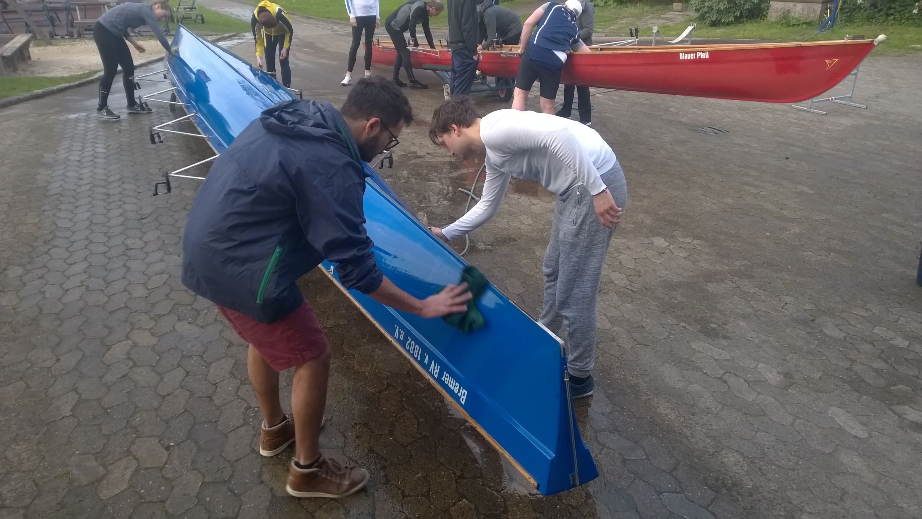 Hinterher werden die Boote noch kurz abgeschrubbt, verstaut und Arne gibt eine kurze Einführung in die Benutzung der Rudermaschinen zur Verbesserung des Bewegungsablaufs. Wer noch Lust und Zeit hat, bleibt auf ein perlendes Getränk samt Snack zur Nachlese. Diese Nachbesprechung gehört laut Arne eigentlich zum Training und ist obligatorisch, an diesem Tag beteiligt sich leider nur die Elite, vielleicht ändert sich das ja bei den nächsten Treffen…