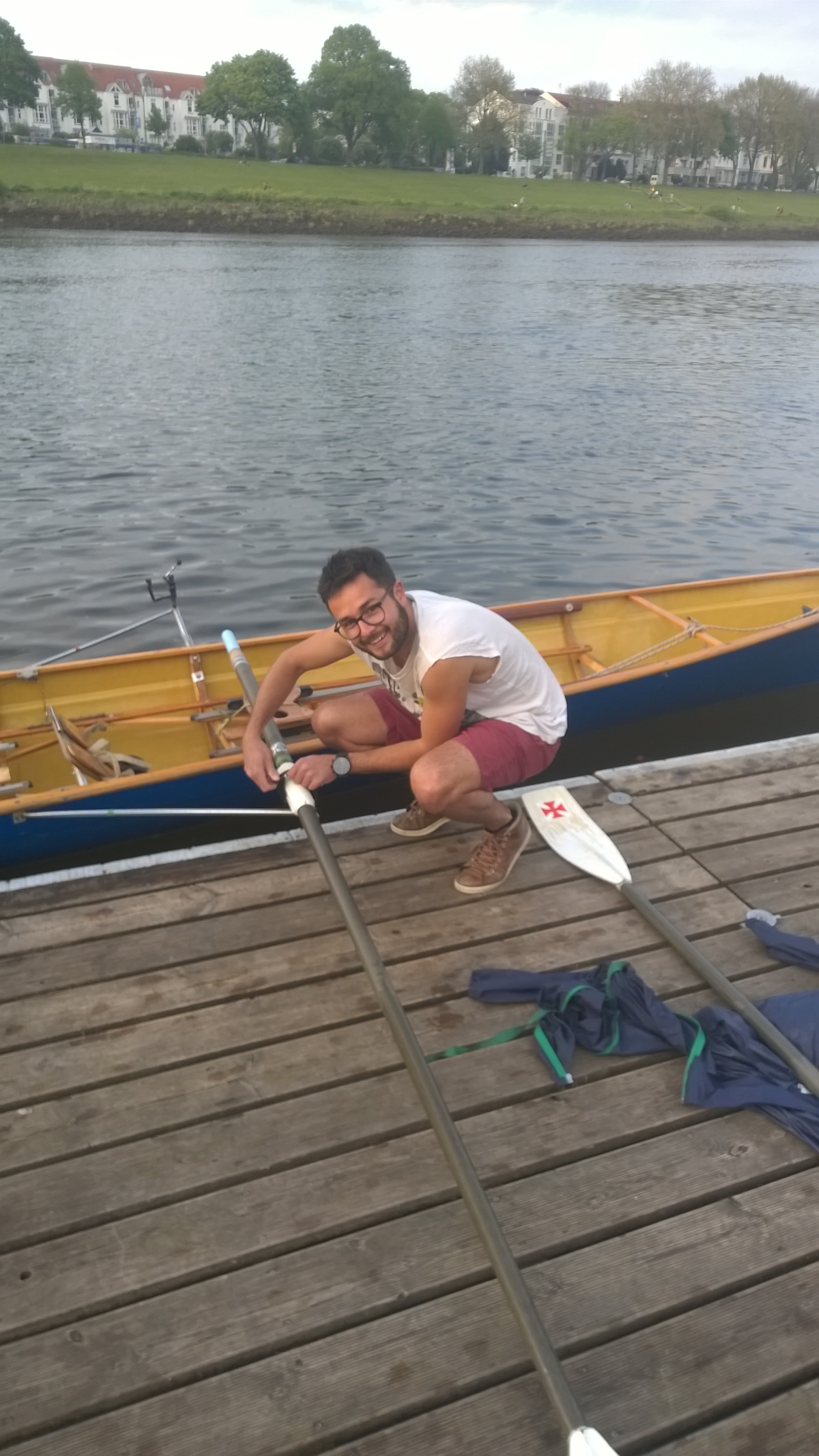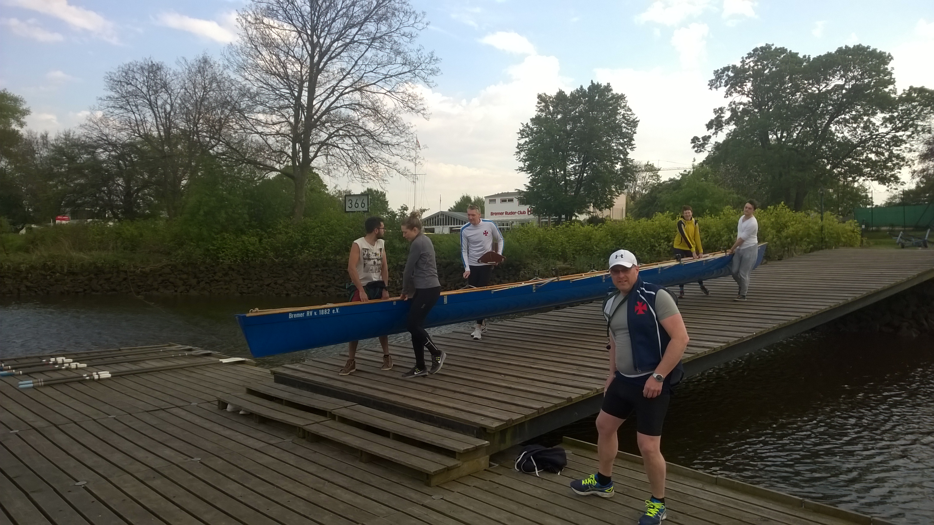 es ans Einsteigen. Danach werden alle nötigen Einstellungen vorgenommen und wir paddeln mit zwei Vierern und einem Doppel los. Auf dem Wasser merkt man, dass richtiges Rudern doch etwas anderes ist, als mit Oma über den Emmasee zu schippern. Aber das Gefühl bei untergehender Sonne Richtung Weserstadion zu paddeln, ist einfach genial! Kleine Wettfahrten mit den bei Ruderern offensichtlich nicht sehr beliebten Drachenbooten, gehen leider unentschieden aus, aufgrund kleinerer Defizite in der Rudertechnik unsererseits.