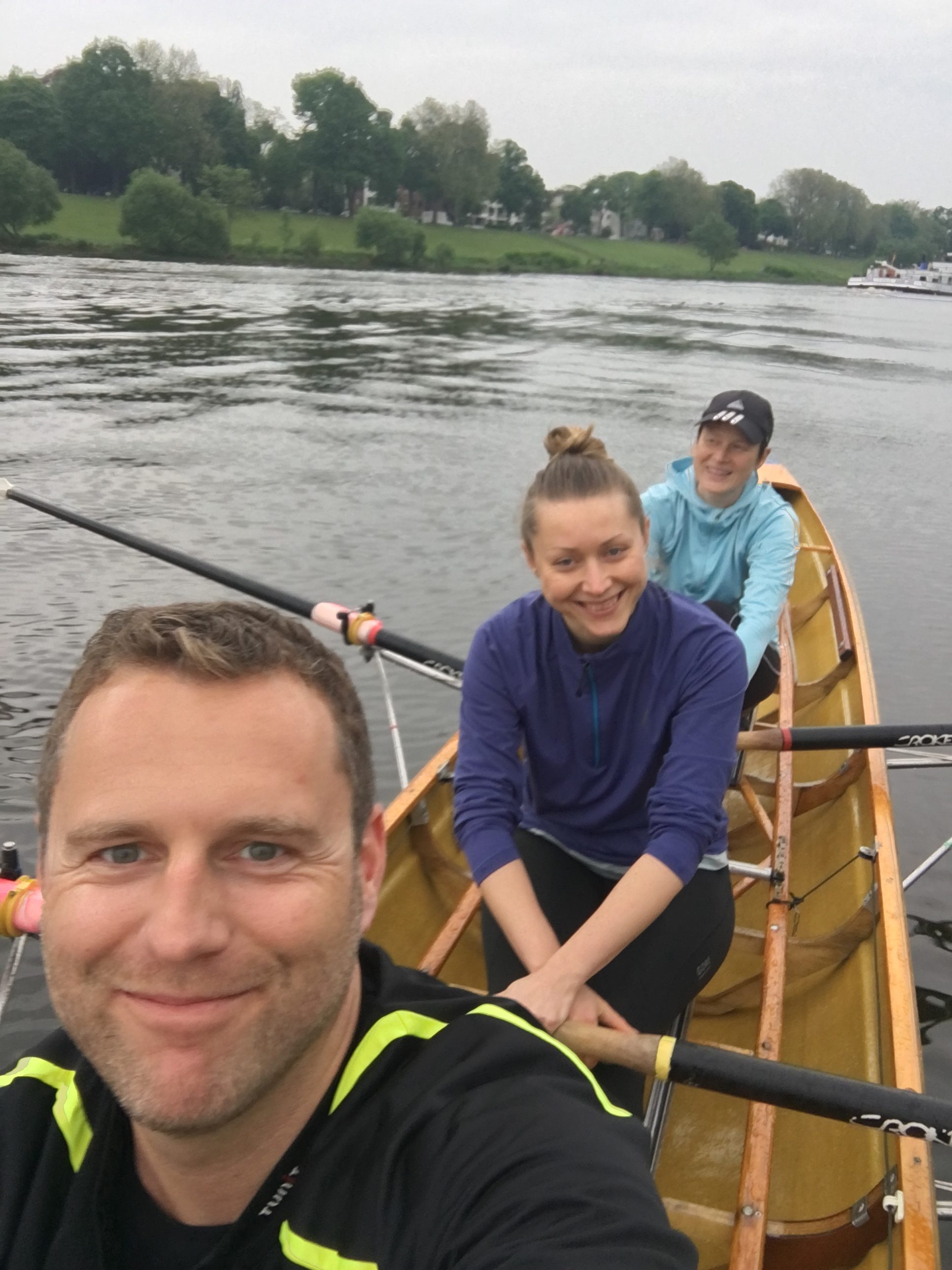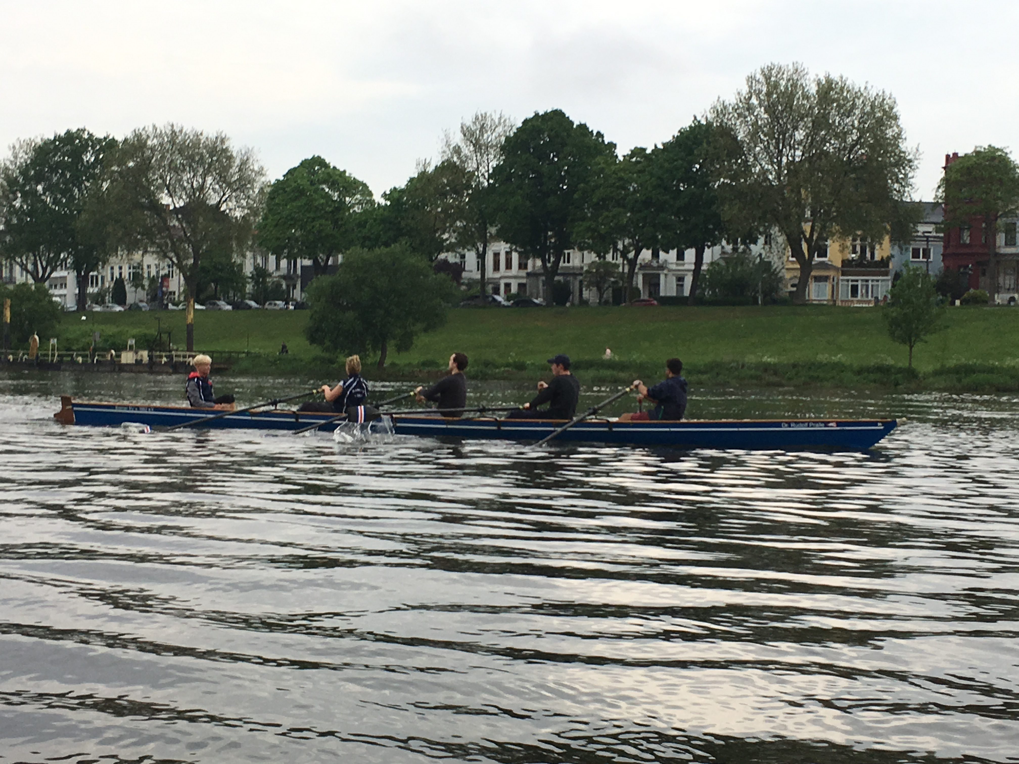 Lutz schlägt vor Richtung Schlachte zu rudern. Zwischendurch wird er sogar übermütig und erzählt von einer Tour nach Borgfeld. Wir schaffen es zumindest unter der Wilhelm Kaisen Brücke hindurch. Bei den Wenden gibt es leider noch leichte Koordinationsschwierigkeiten, aber wir sind ja noch in der Lernphase. Dafür klappt das Anlegemanöver ziemlich gut. Schade, dass der nächste Termin wegen Himmelfahrt ausfallen muss, aber die Vorfreude auf das nächste Training überwiegt…