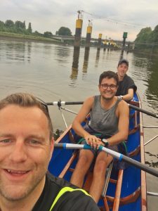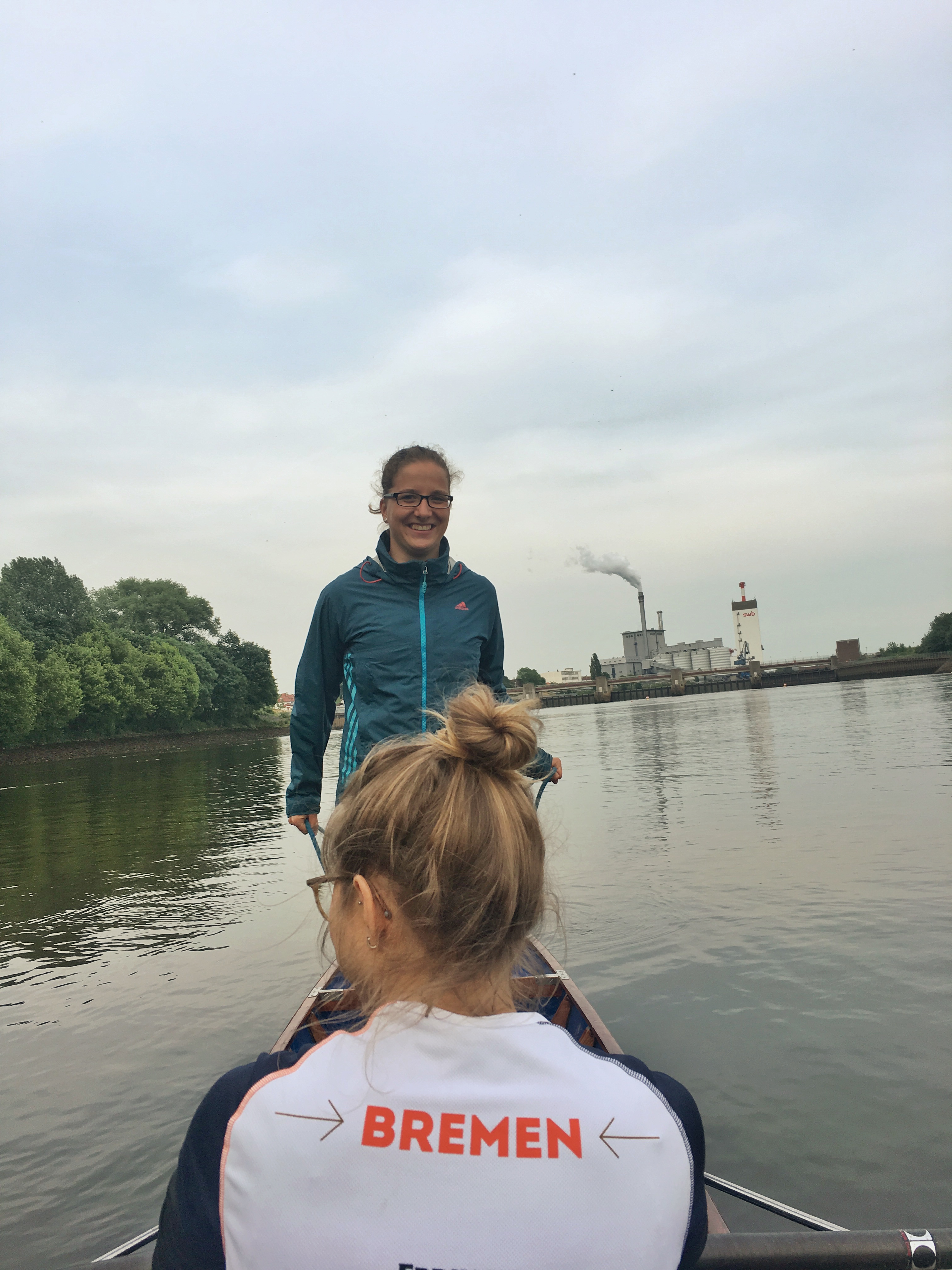 Leider sind nur fünf Teilnehmerinnen gekommen. So füllen wir einen Vierer mit Johanna als Steuerfrau und unsere zweite Trainerin fährt mit Julia alleine im Zweier. Das Abstoßen klappt wieder sehr gut. Wir machen uns auf den Weg Richtung Wehr. Die Bewegungsabläufe sitzen bei den Meisten schon, es gibt eigentlich nur einen Verbesserungsvorschlag der immer wieder wiederholt wird: „Ruhig auf der Rolle!“