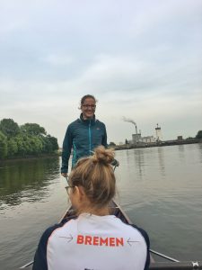 Auf dem Rückweg wird es kurz leicht hektisch, weil die Strömung recht stark ist und wir etwas zwischen die Anlegestege der Binnenschiffe geraten. Johanna manövriert uns aber professionell aus dieser Lage und wir üben bei halber Kraft weiter unsere Bewegungsabläufe. Zum Schluss machen wir noch ein paar Wenden und legen dann erfolgreich wieder am Steg an.