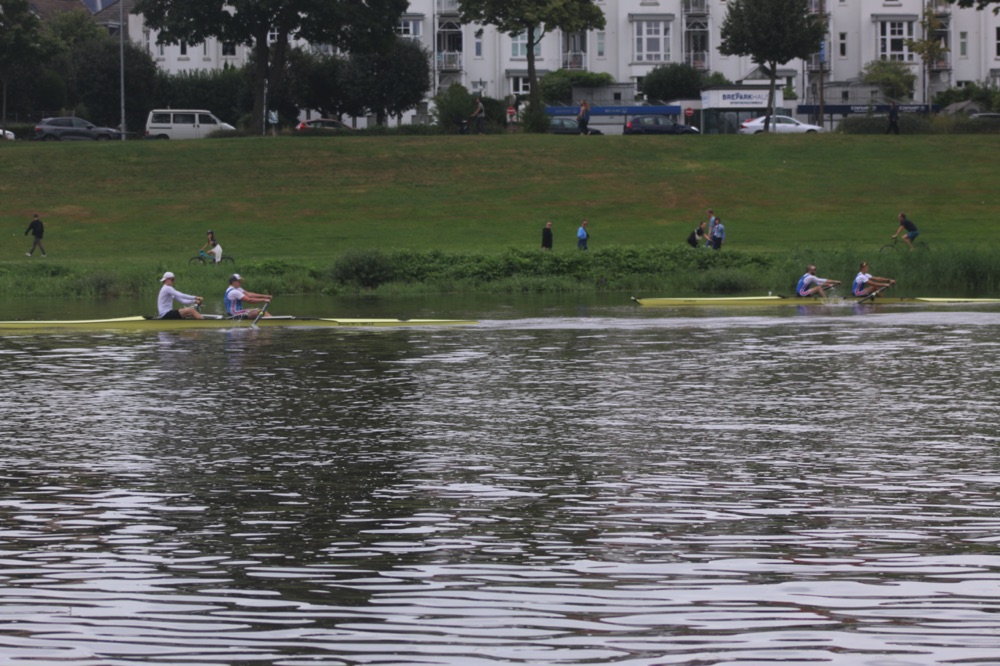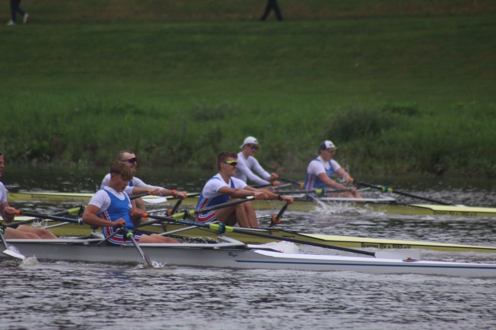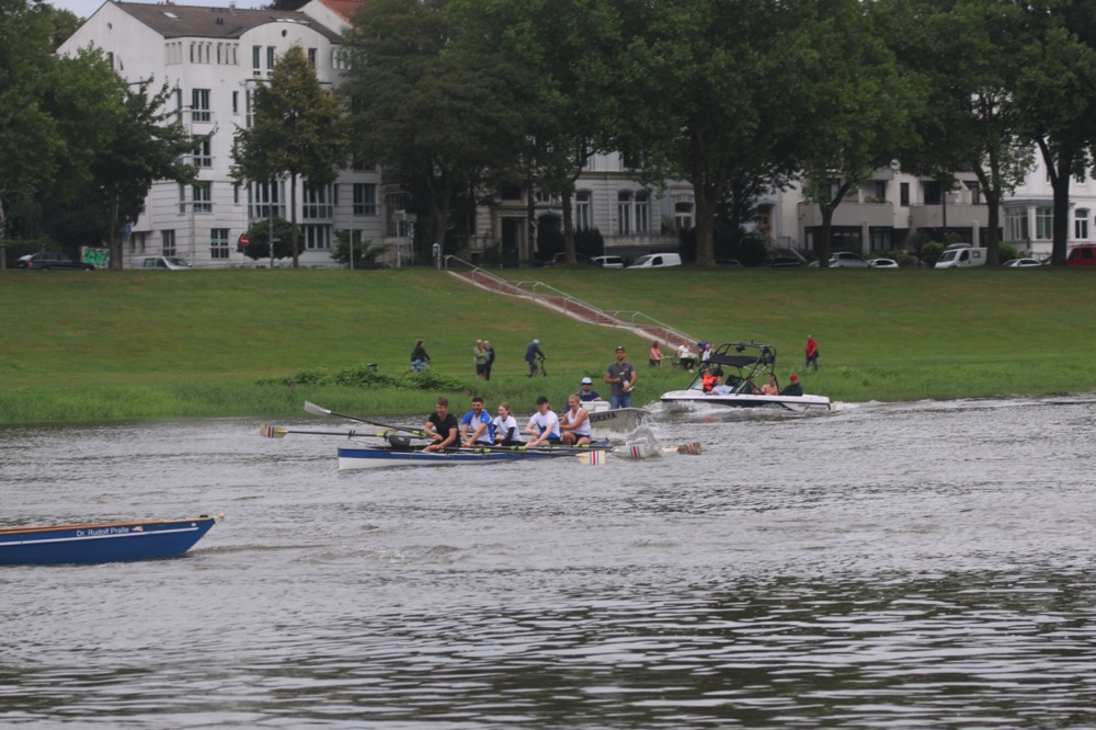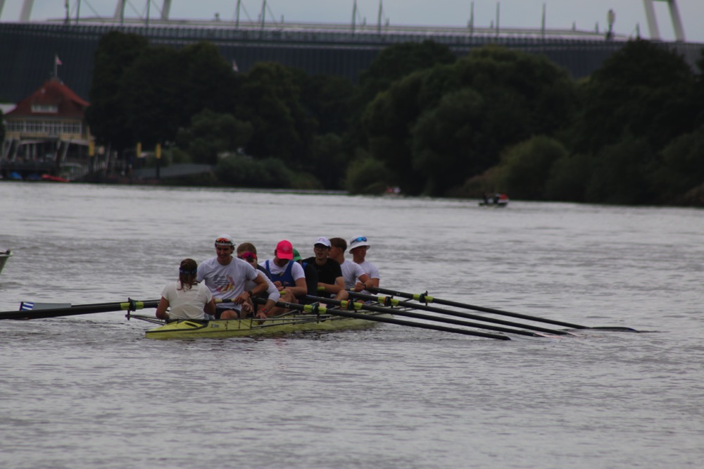 Auch im Achterrennen gab es Steuerprobleme. Fünf Boote konnten nur aufgrund des Hochwassers zum Zeitpunkt des Starts auf die Strecke gehen und es war durchaus eng. Kurz vor dem Ziel wurden die Steuerprobleme im bis dahin zweitplatzierten Boot so massiv, dass es zu einem Riemen-Kontakt mit dem bis dahin drittplatzierten Boot kam und beide nur noch bis ins Ziel „trudeln‟ konnten – das zu diesem Zeitpunkt viertplatzierte Boot nutze diese Chance und schob sich noch an den beiden Havaristen vorbei.