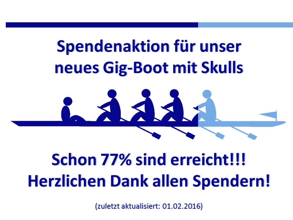 Zu Beginn des neuen Jahres wurden erneut 2.000 EUR für unser neues Gig-Boot gespendet. Somit benötigen wir gemäß dem Spendenstand an unserer Jahreshauptversammlung nur noch 1.900 EUR an Spenden, um die Bestellung für das Gig-Boot auslösen zu können.
