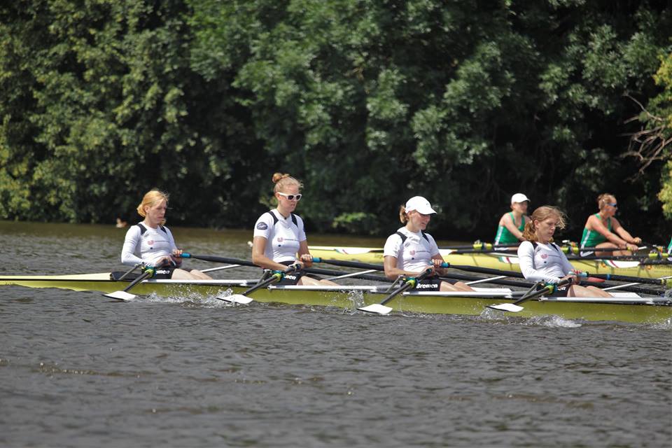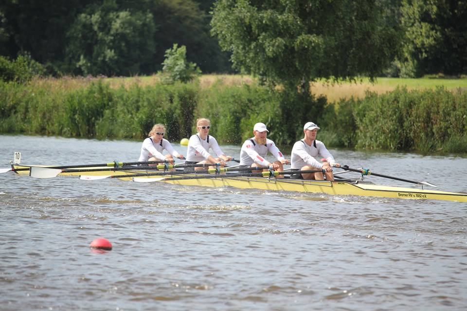In diesem Jahr wurden auch wieder die Anfänger Rennen in den Gig Booten ausgeführt. Am Samstag konnten im Doppelvierer unsere Studenten Tom, Dietrich, Felix und Alex, mit Lisa Baues an den Steuerseilen, erste Regattaerfahrungen in vier Rennen sammeln. Vom Vorlauf über den Hoffnungslauf ins C-Finale ruderten sie auf den 15. Platz. Das Mixed-Rennen am Sonntag, mit einem Wahnsinnsfeld von 32 Booten, wurde für die Uni Bremen von Vanessa und Lisa mit Tom und Dietrich als starke Mitte vertreten. Gesteuert wurden sie von altbewährten Seniorinnen und Senioren. Der stark gesetzte Vorlauf führte die Vier in den Hoffnungslauf, der souverän gewonnen wurde. Leider war im Halbfinale kurz die Luft raus, so dass es leider nur für das C-Finale reichte. Hier riefen sie nochmal alles ab, was sie in Bolkos Trainingseinheiten gelernt hatten und sicherten sich mit neun Sekunden Vorsprung den Sieg.