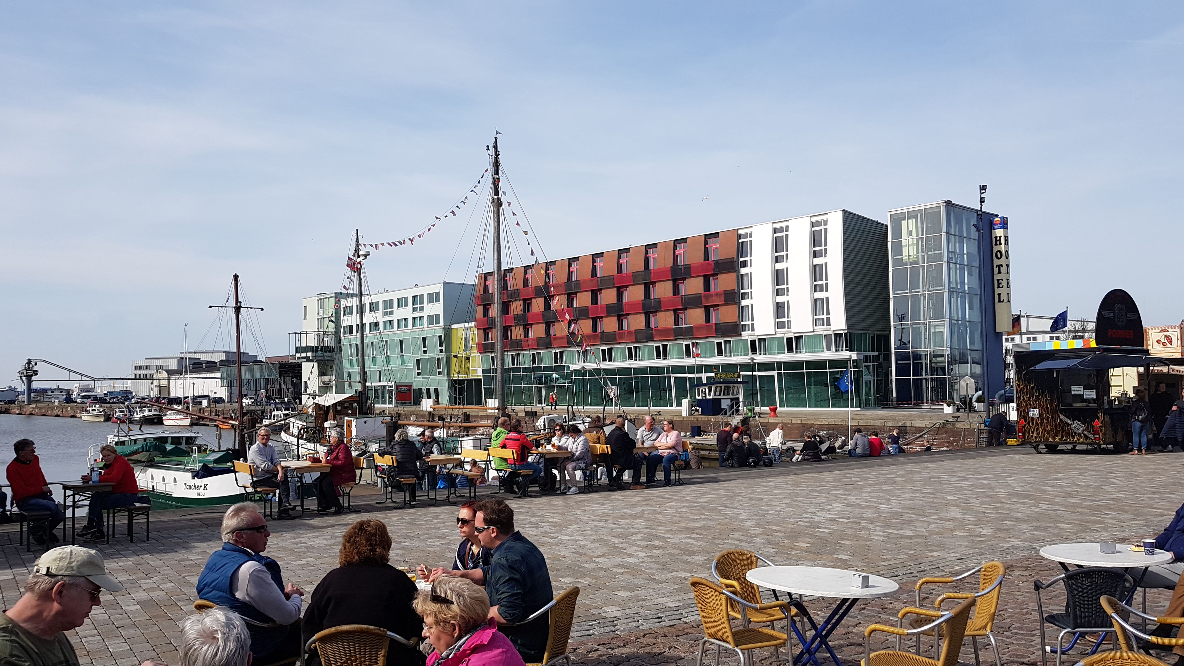 Die Wartezeit bis Tom das Gespann aus Bremen geholt hatte konnten wir uns am Kopf des Hafens sehr gut vertrieben, da dort sehr viele schöne Restaurants ihre Tische bei diesem herrlichen Wetter nach draußen gestellt hatten.
